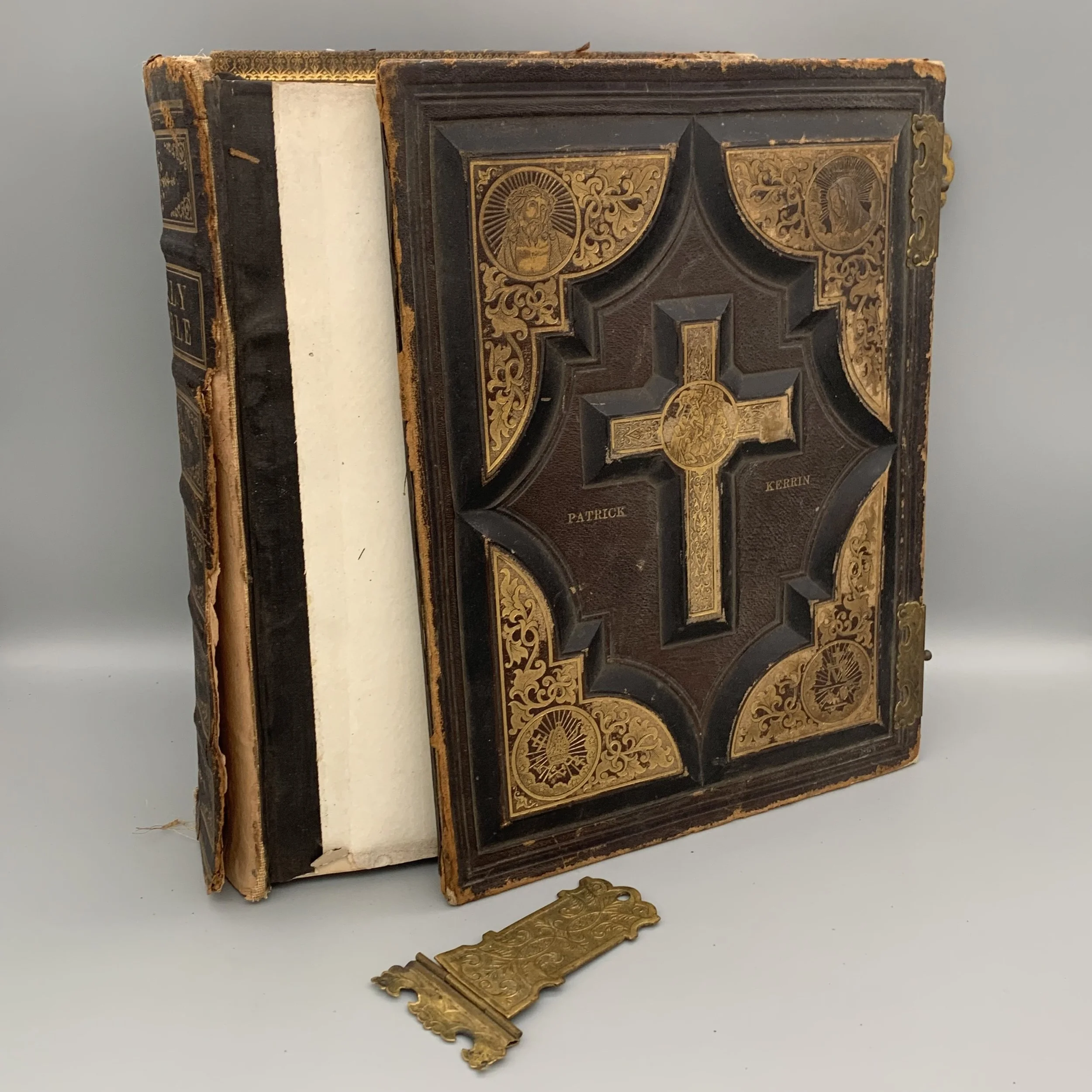 We repair a lot of large family Bibles each year. Most are from the 1800’s and are beautifully decorated. The art is often intricate and unlike anything seen today. They also contain amazing family history. Unfortunately, many have not been properly stored so the leather has become very deteriorated. These are often some of the more involved projects we do. We usually create a new spine for the Bible and often are able to overlay the original spine so as to keep as much of the original cover as possible. Leather conditioner can be applied and the covers can also be re-dyed to help cover worn areas and give it a fresh look. A clear spray coat can help protect the cover and makes the foil decoration shine again. It almost makes the Bible look like it is new again. At times, the clasps need to be repaired as they have become bent or nails have been lost. It is a pleasure working on these large family Bibles.